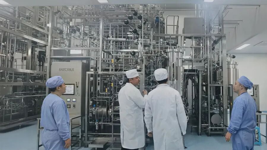 洪亮(右二)在金赛药业5000升工业化生产线上。
