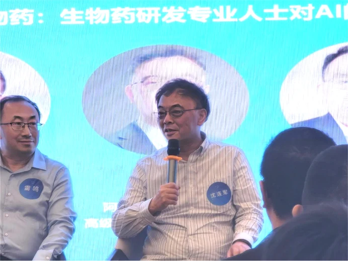 在圆桌讨论环节,沈连军博士、雷鸣博士、李兆忠博士以及答亮博士四位嘉宾,以《生物药研发专业人士对AI的期待和展望》为题进行探讨,阐述了AI在抗体药物、细胞治疗、基因治疗、IVD领域的应用与挑战,并与现场观众进行了热烈的互动。